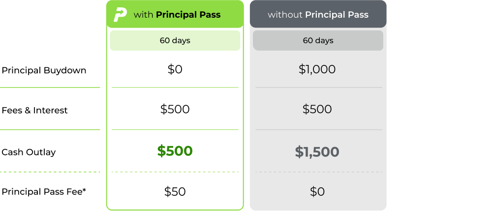 Pay $0 in principal payments with Principal Pass – for a small fee, delay your principal payments and save cash at curtailment by only paying accrued fees and interest.