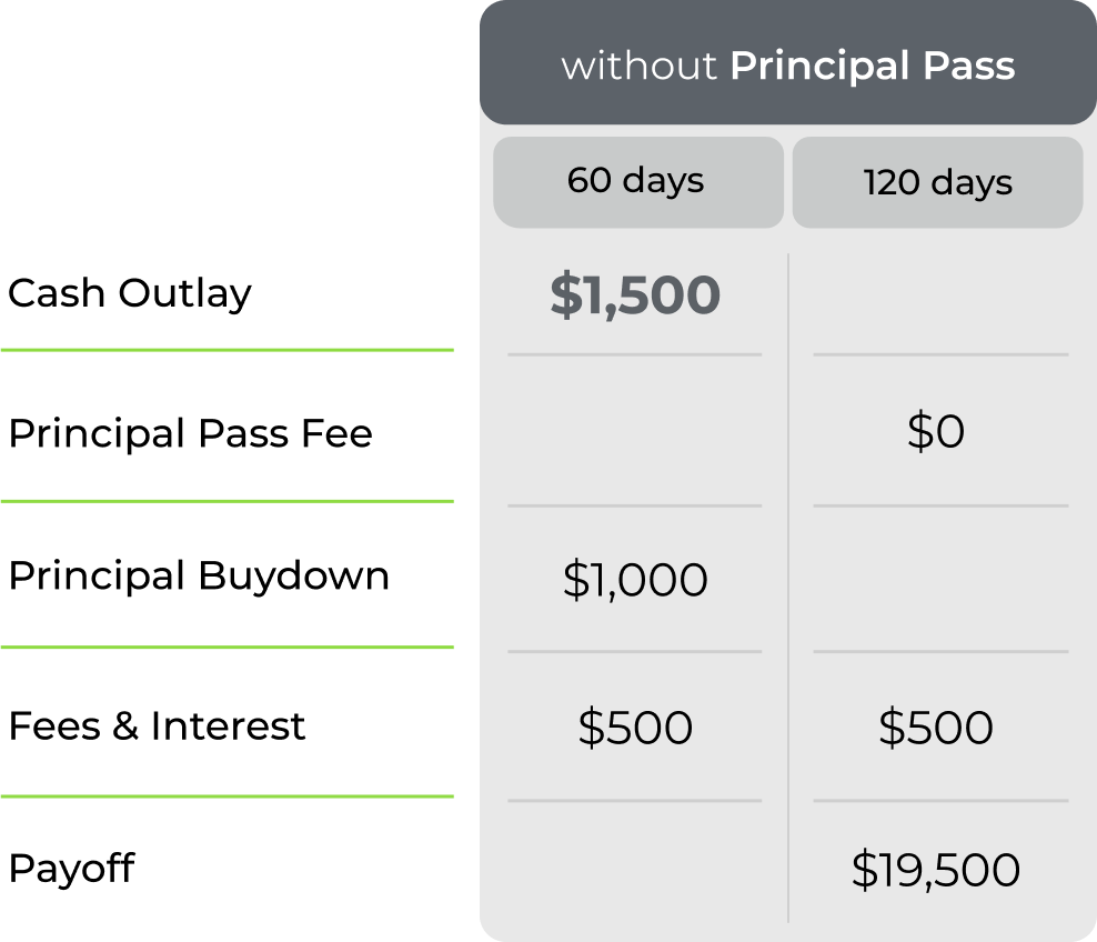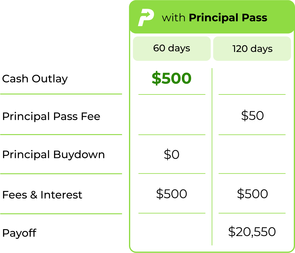 Pay $0 in principal payments with Principal Pass – for a small fee, delay your principal payments and save cash at curtailment by only paying accrued fees and interest.